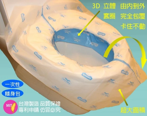 全球首創專利3D立體造型,顛覆傳統馬桶坐墊紙平面式外形,可將馬桶由內到外完全包覆,平穩定位,不再滑動,更特別選用防滲材質,徹底解決消費者長久在外衛生如廁的困擾